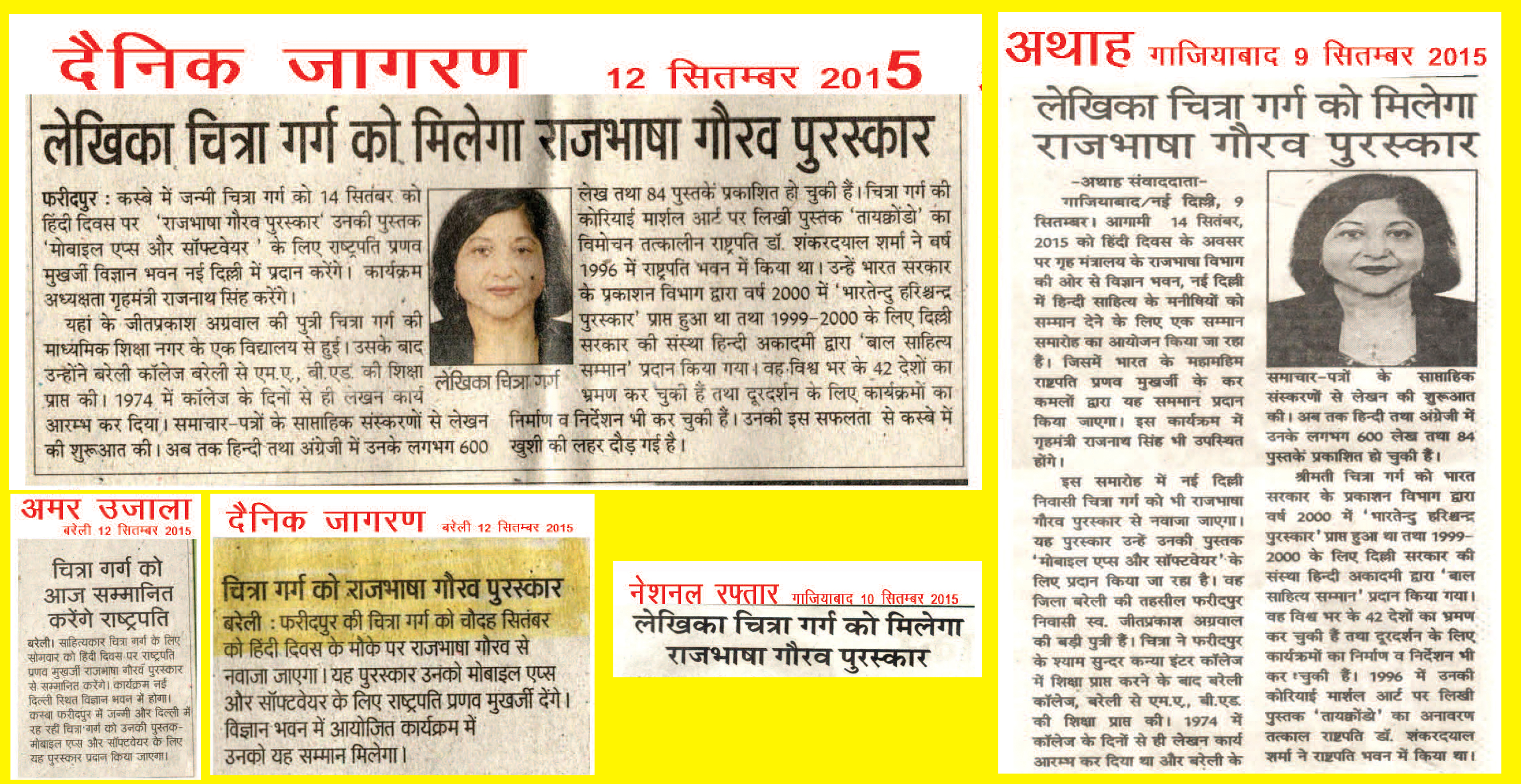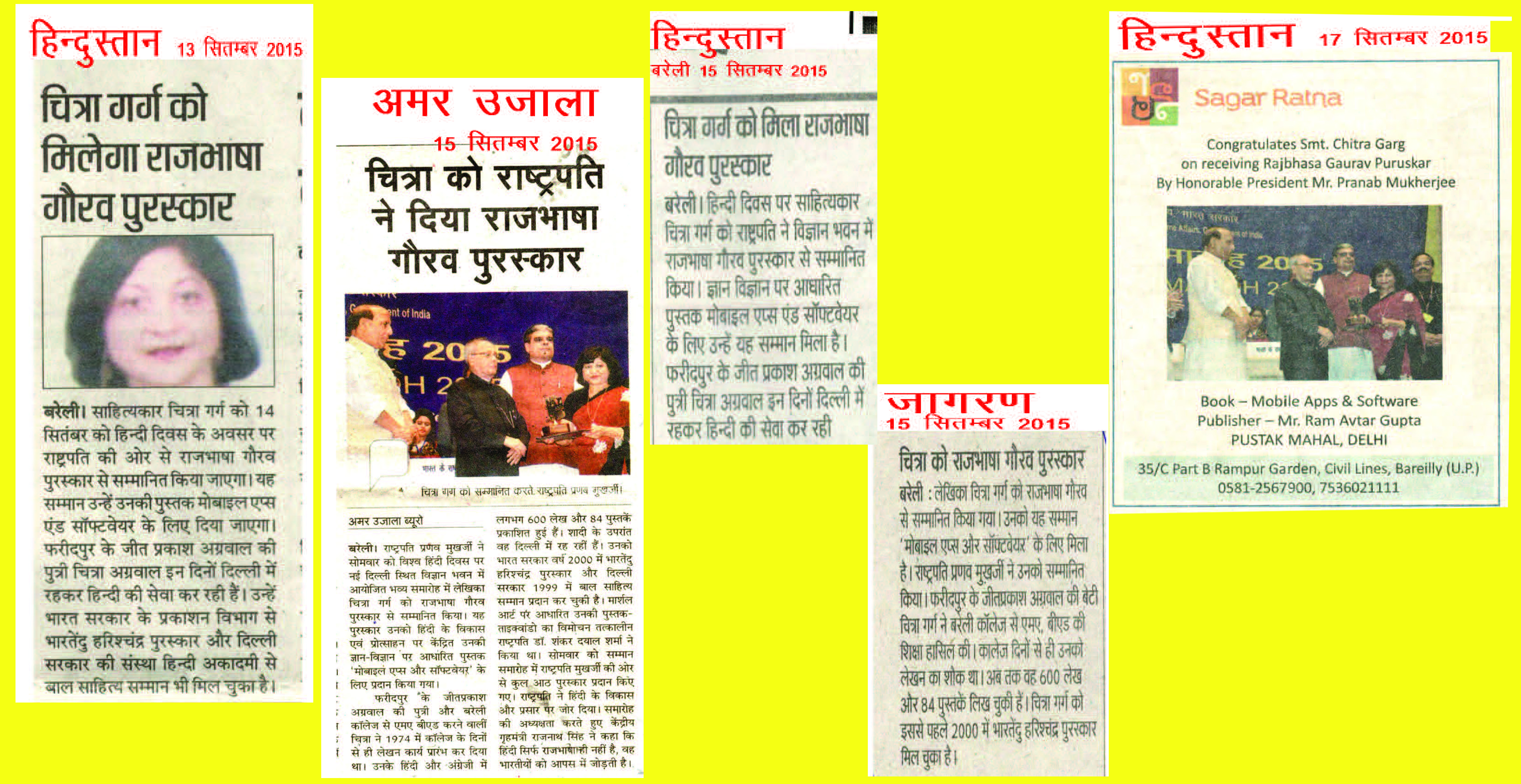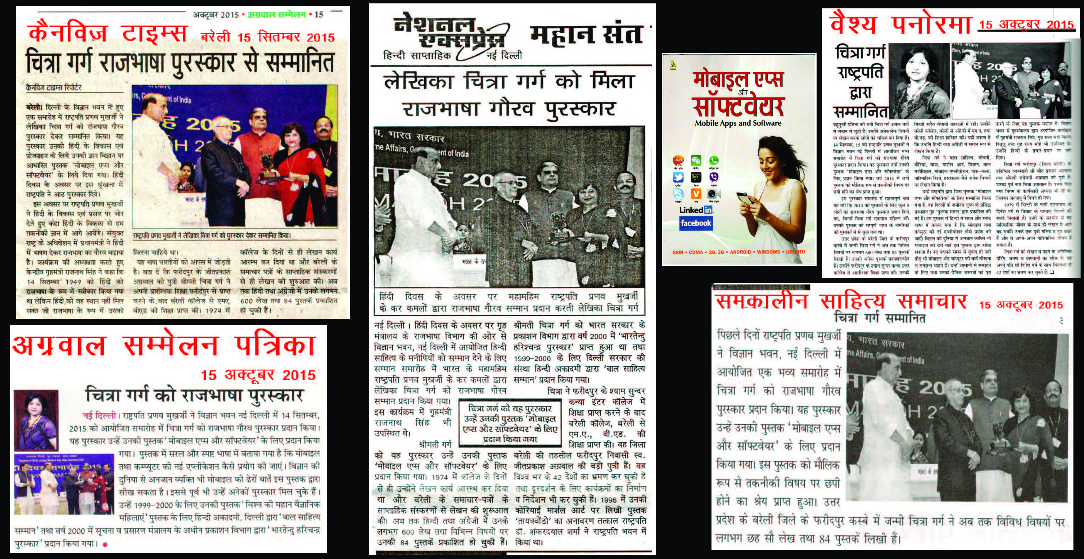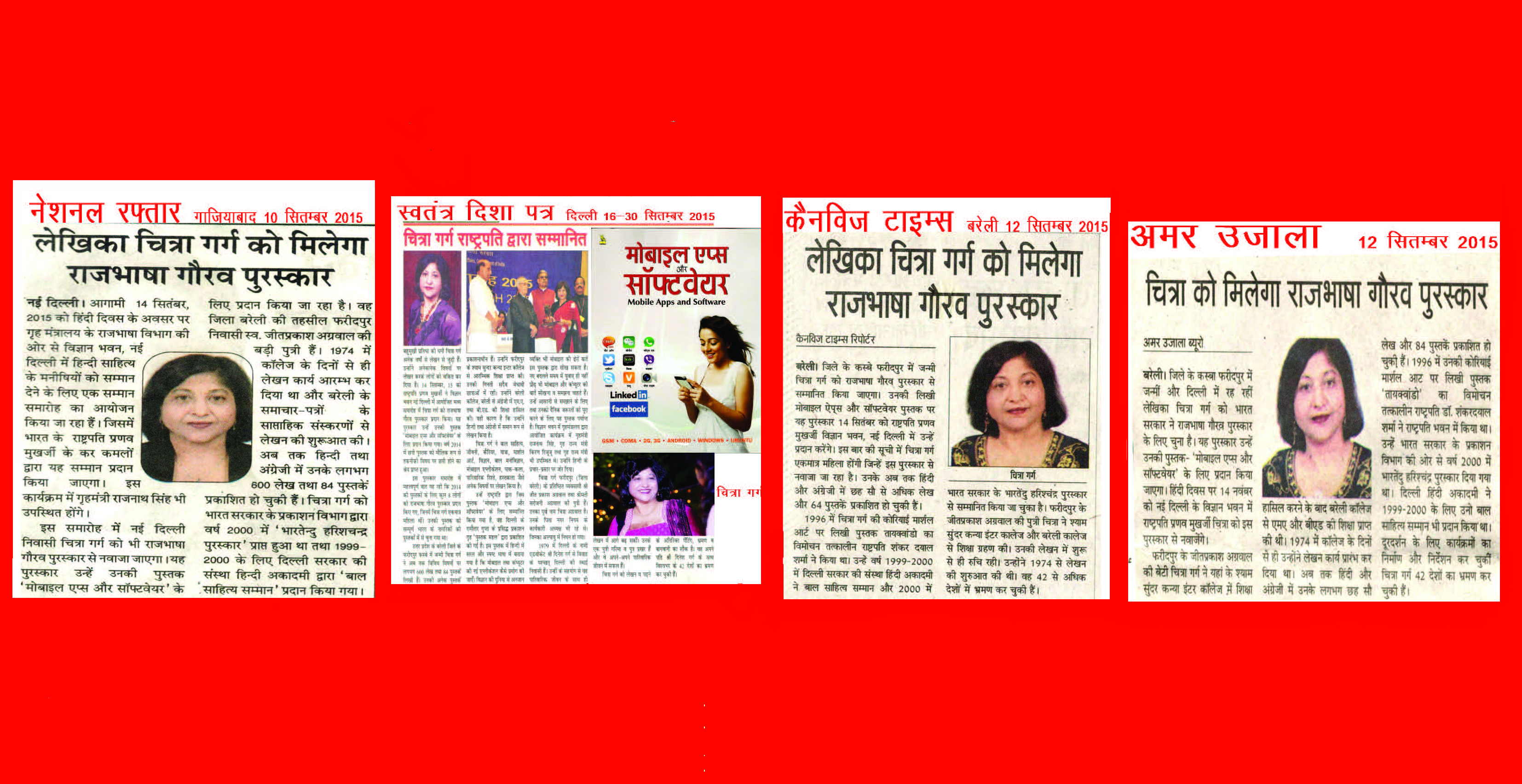In 2015, Chitra Garg has been awarded Raj Bhasha Gaurav Award for her book 'Mobile Apps aur Software' by the Home Ministry of India. The award was presented by the President, Pranav Mukherjee in the presence of Home Minister Rajnath Singh Minister of State-Home Kiran Rijuju on 14th Sep, 2015.This news was covered by many newspapers and media.