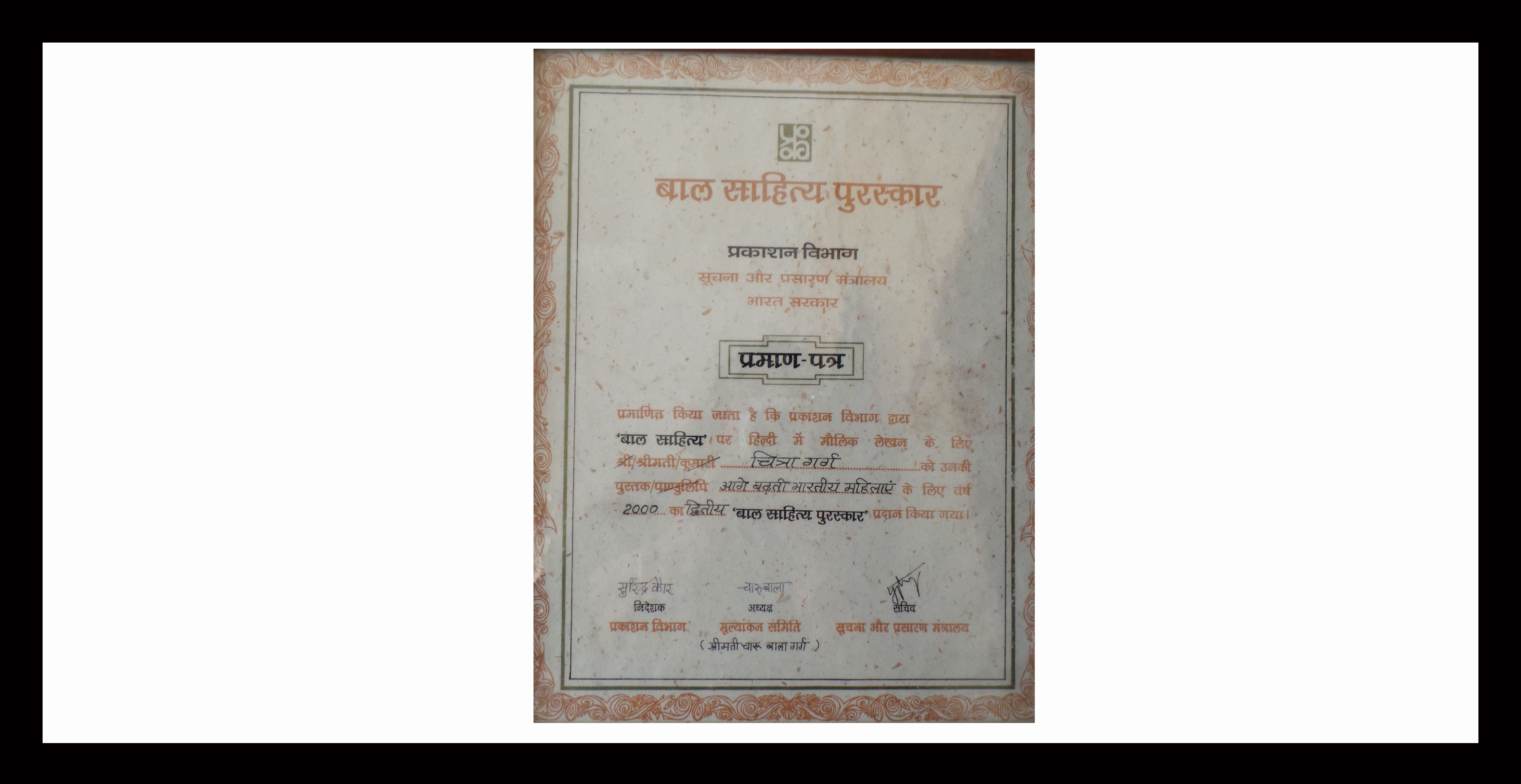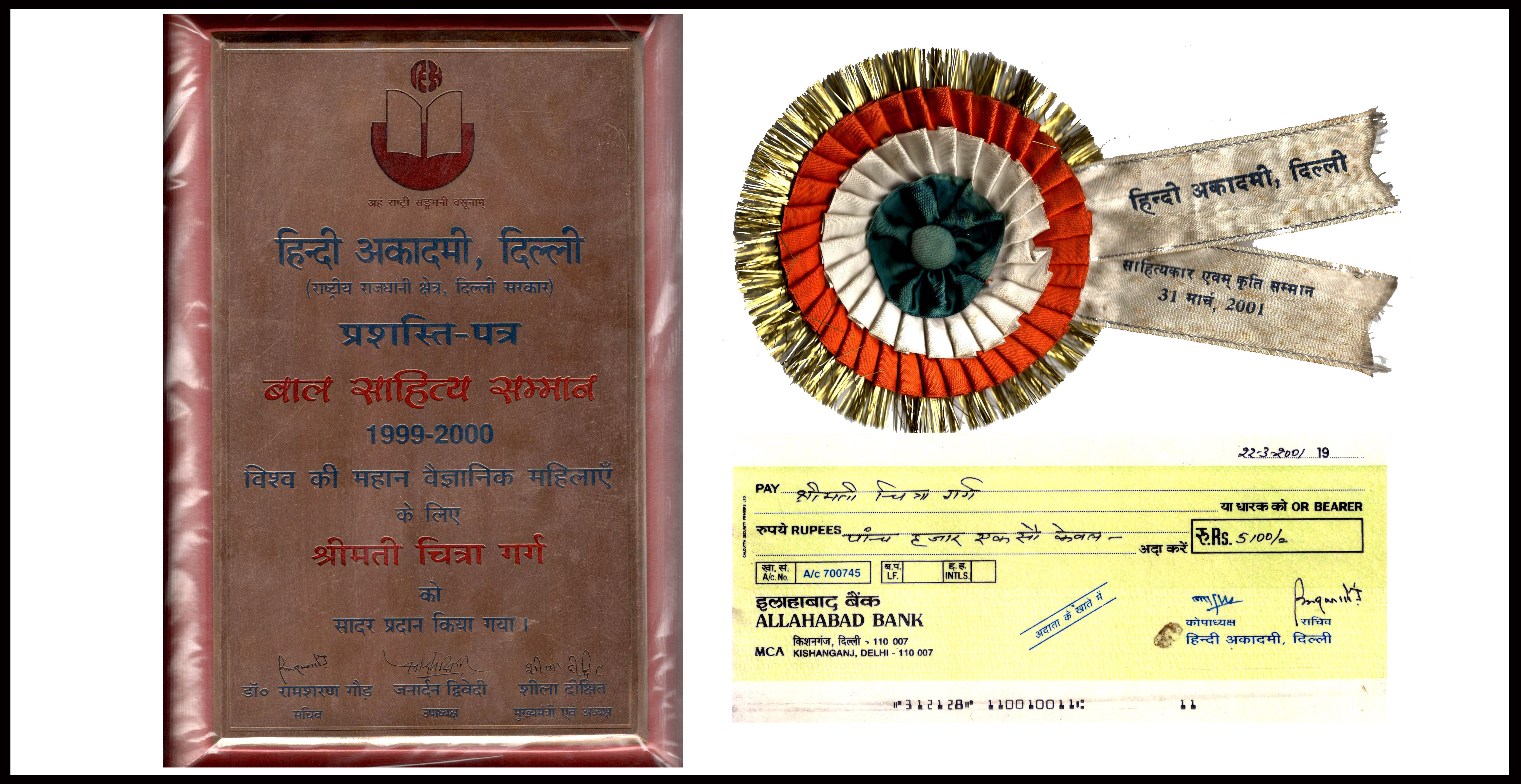 Chitra Garg has been Awarded 'Bal Sahitya Samman' For her book 'Vishwa ki Mahan Vaigyanik Mahilayen'for the year 1999-2000 by the Hindi Academy (Delhi Government). The award was presented by the celebrity Zohra Sehgal.