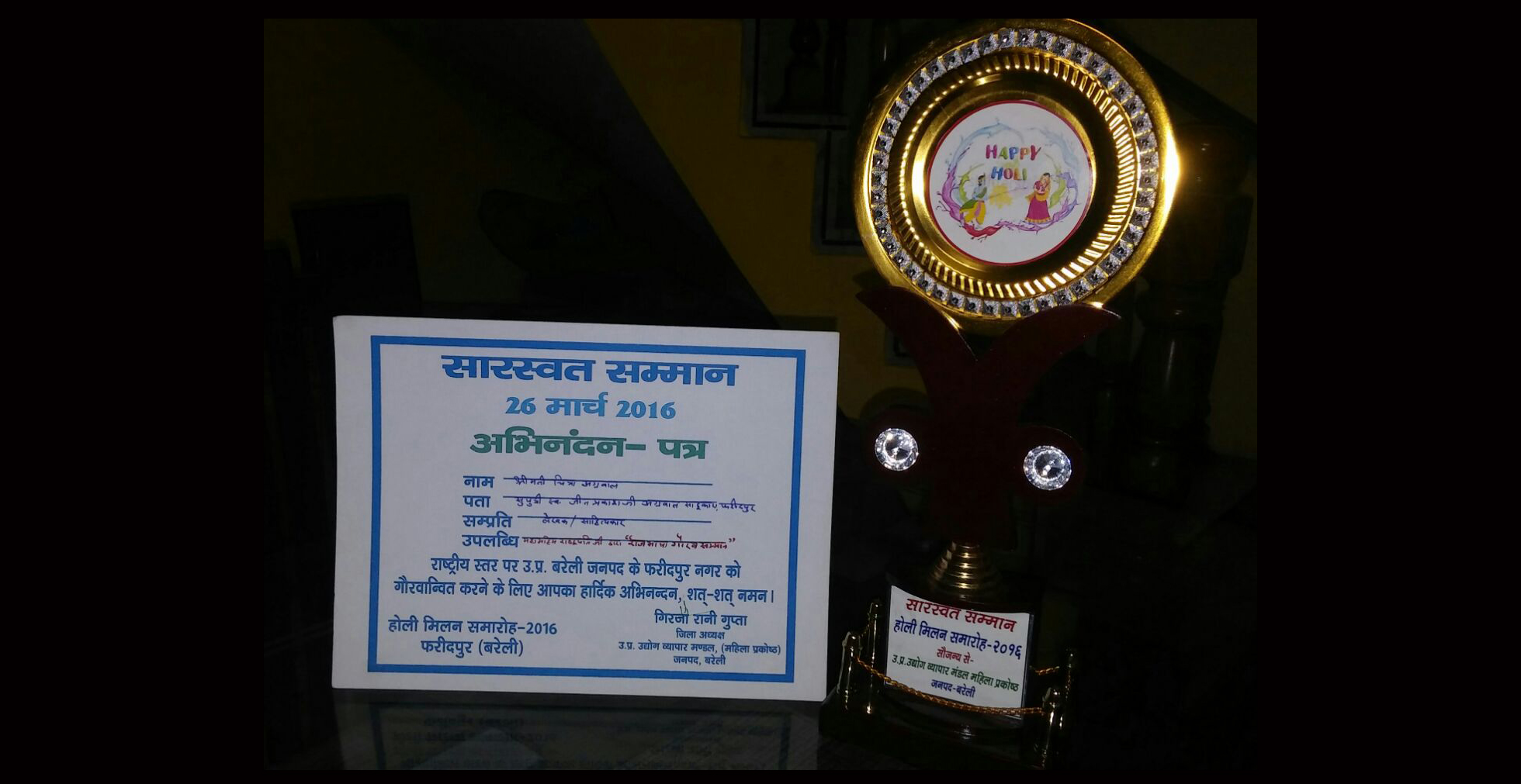 She was awarded Saraswat Samman by Udyog Vyapar Mandal, Faridpur in 2016.